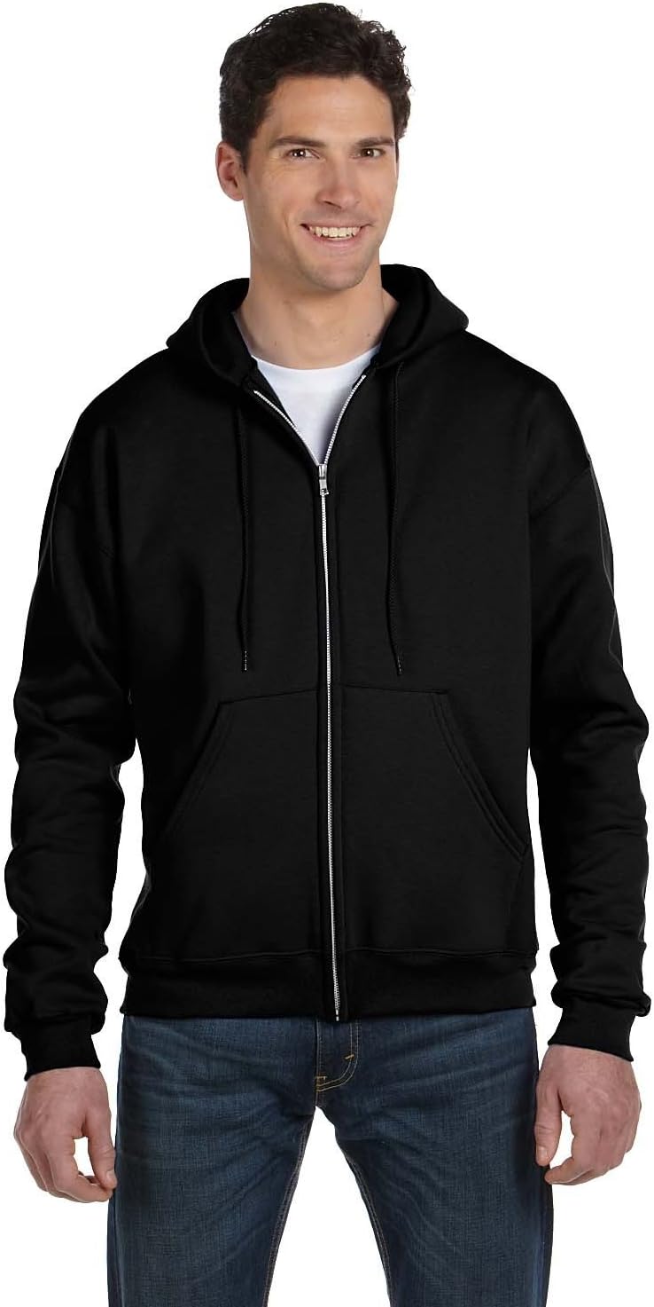 This Champion EcoSmart Full-Zip Hoodie, a blend of 50% cotton and 50% polyester (5% recycled), offers superior softness and durability. It features 1X1 rib cuffs and waist with spandex for shape retention, a two-ply hood with a basketweave tipped drawcord, a front pouch pocket, and a full zip front with an aluminum zipper. Available in Black, Dark Green, Light Steel, Navy, Silver Grey, and White, and sizes S to 3XL.