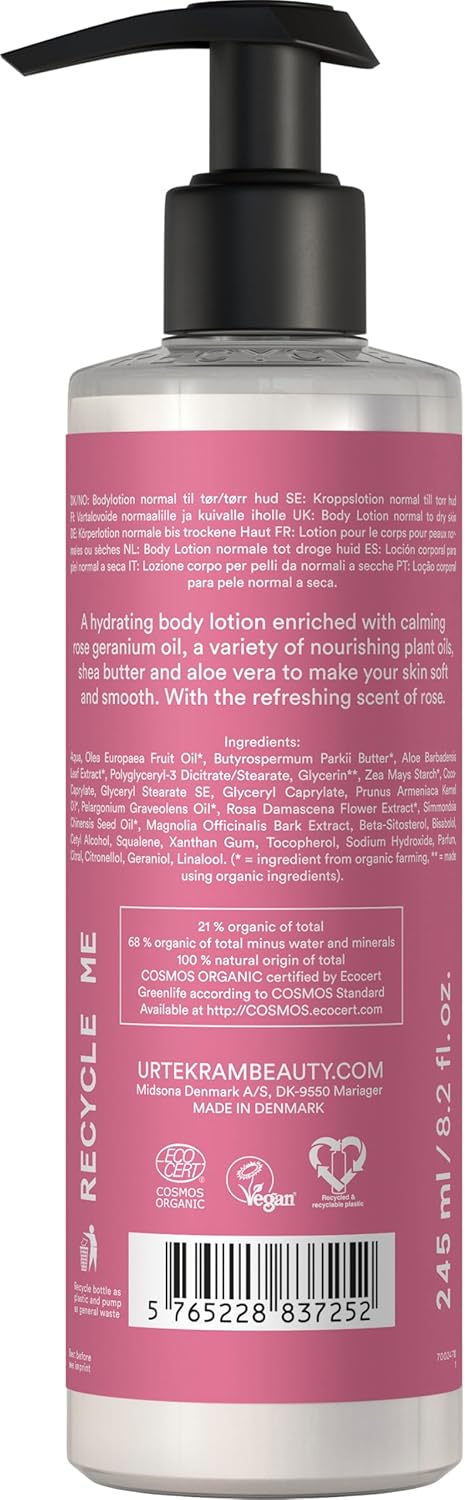 Urtekram Rose body lotion you’ll experience how the scent of thousands of roses is coming towards you, while the fine rose geranium oil nurtures and calms the skin. The skin is spoiled with a wide variety of plant oils, shea butter and nature’s own moisture magnet Aloe vera, which leaves the skin soft and healthy. Certified by Ecocert cosmos organic, 100 % natural origin and vegan.