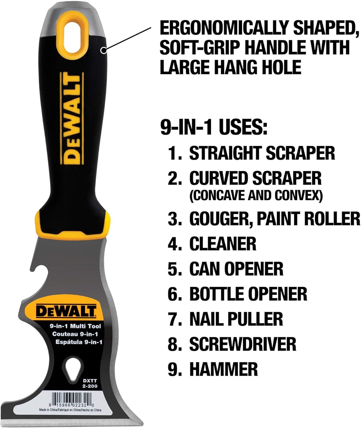 DEWALT 9-in-1 Painter’s Tool | Straight Scraper, Curved Scraper, Gouger, Roller Cleaner, Can Opener, Bottle Opener, Nail Puller, Screwdriver, Hammer | Carbon Steel w/Soft Grip Handle | DXTT-2-200