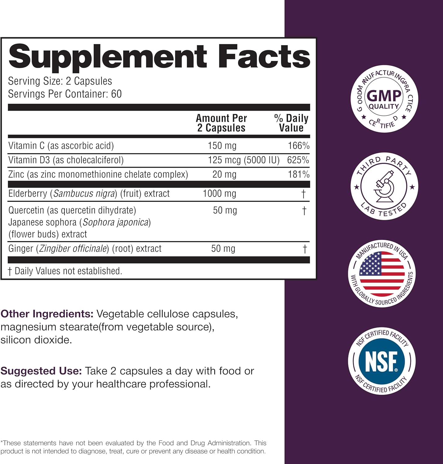 Elderberry Vitamin C and Zinc Capsules for Adults | 120 Count with Quercetin & Vitamin D3 | 6-in-1 Immune Support Supplement Pills | Sambucus Black Elderberry Natural Immunity Vitamins | Made in USA