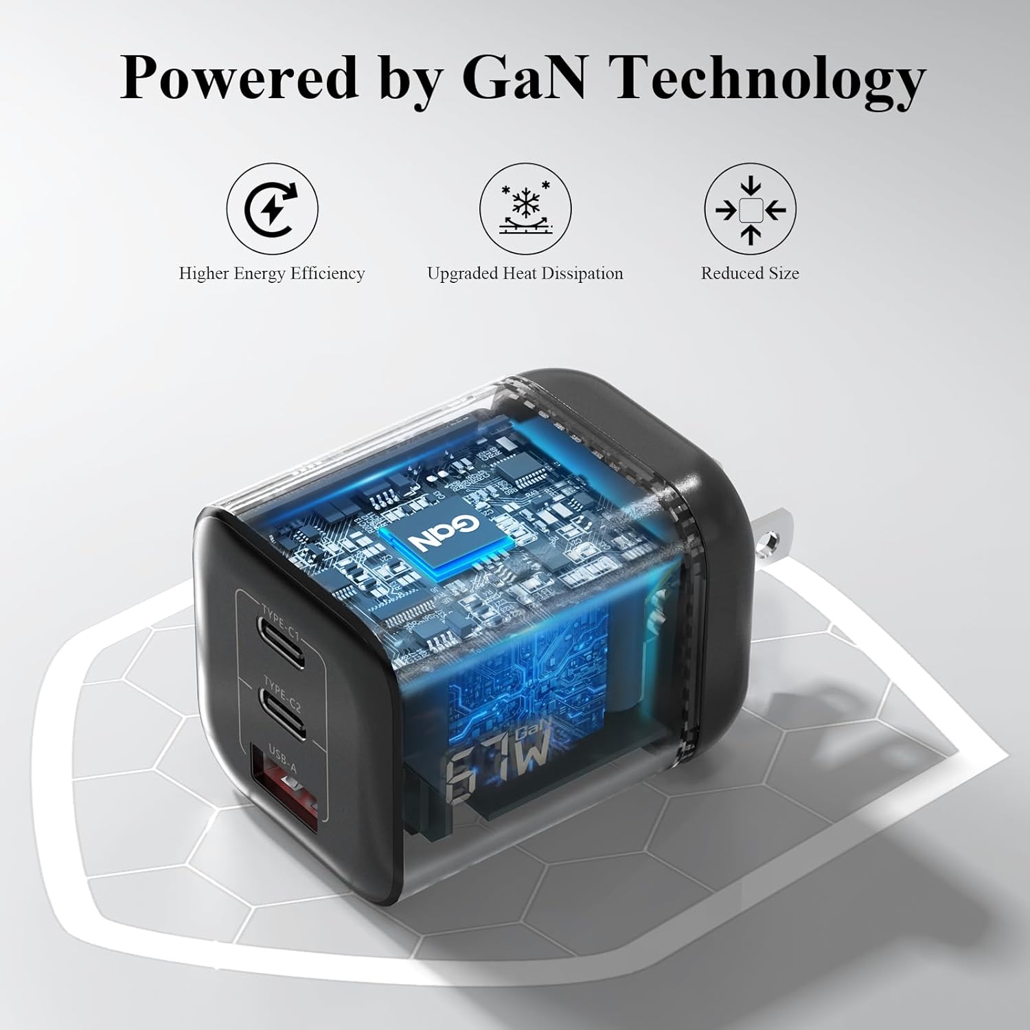 【67W GaN Fast Charging】 Powered by advanced GaN technology and PD 3.0, this charger delivers up to 67W of high-efficiency, low-heat charging. It automatically detects your device to provide optimal voltage, enabling significantly faster charging for smartphones, tablets, and laptops — ideal for powering up in less time.