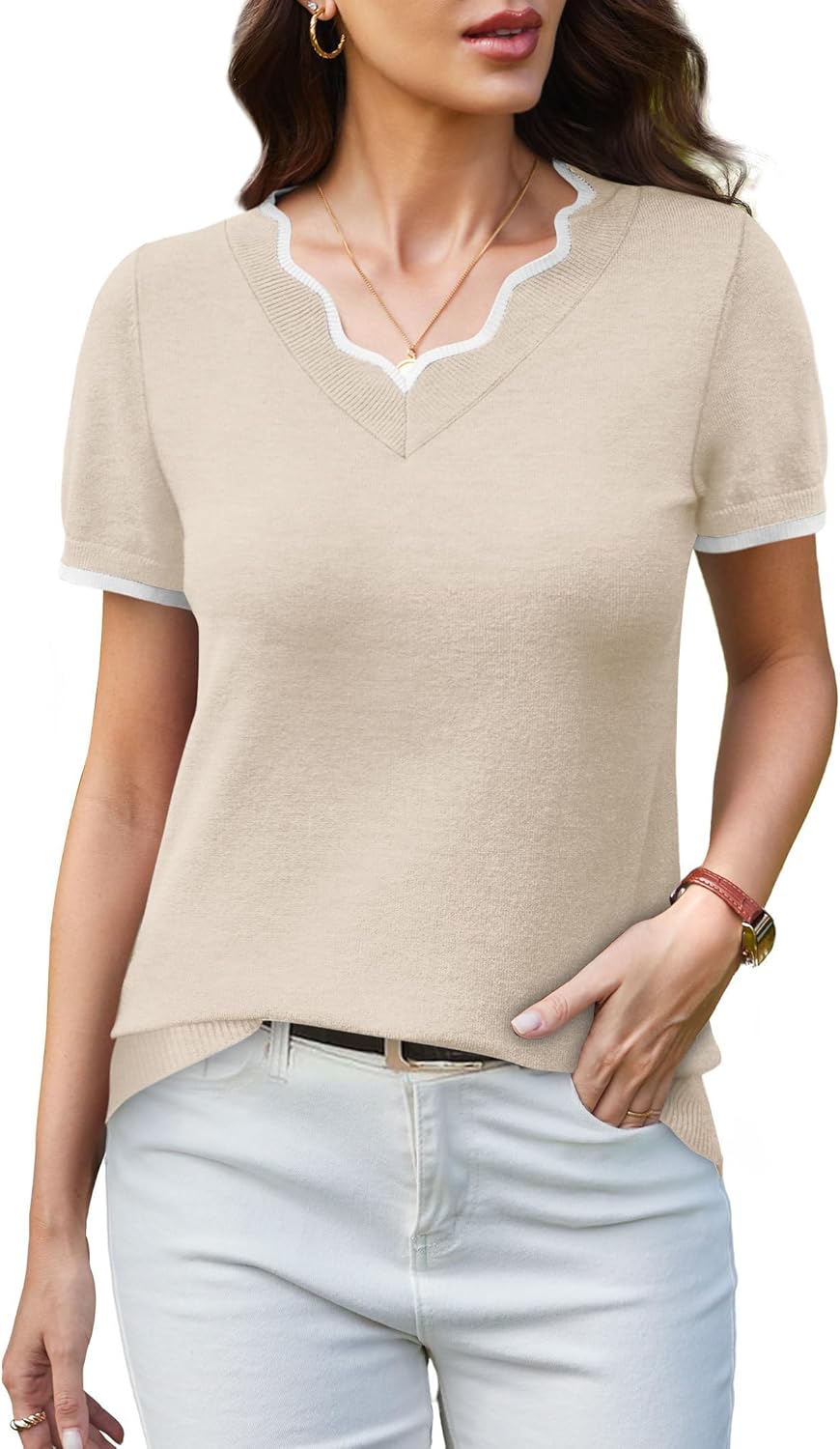 OFEEFAN Short Sleeve Sweater for Women V Neck Lightweight Sweaters Fashion Clothing Business Casual Outfits
