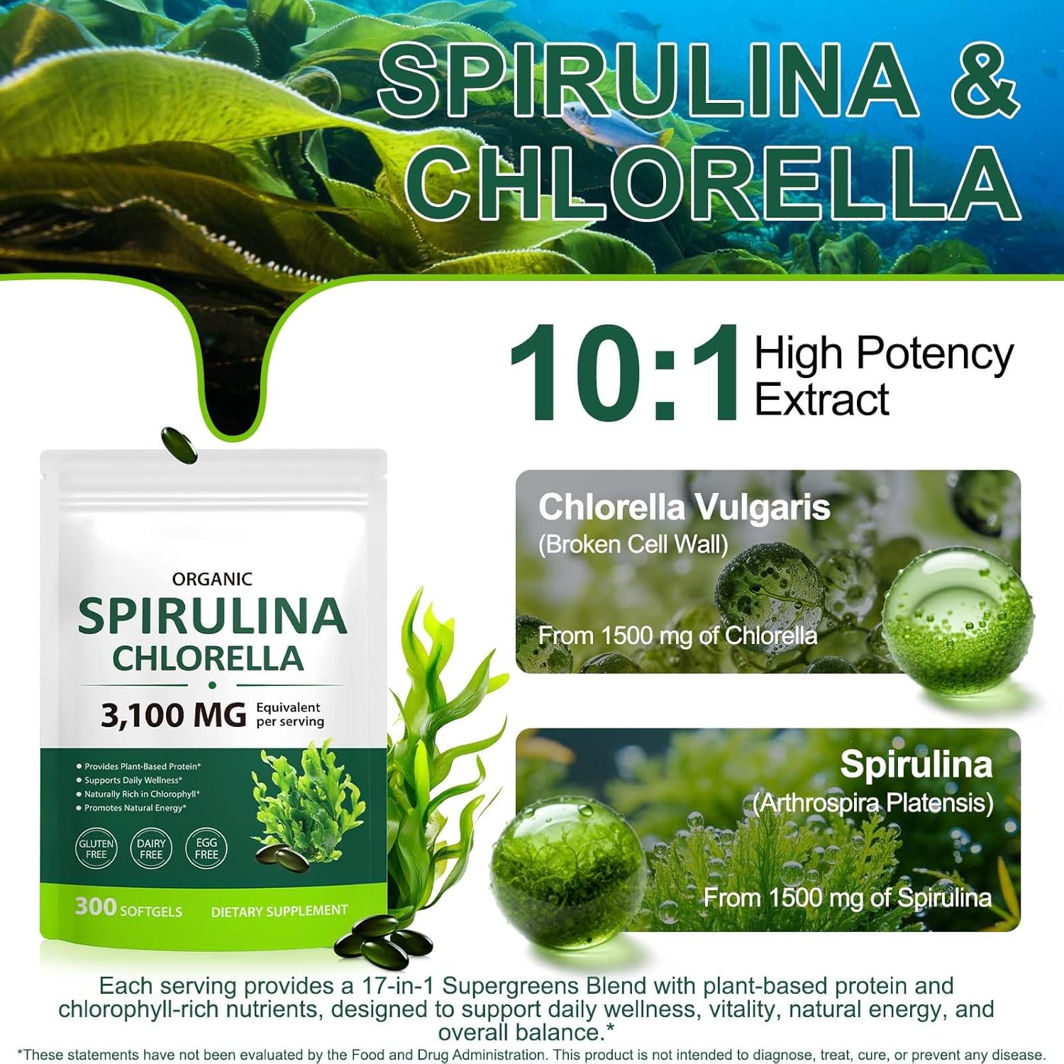 VOGSIG Spirulina Chlorella Capsules, 3100MG Per Serving,17-in-1 Supergreens Blend Rich in Protein, Chlorophyll, Vitamins, Supports Energy, Immune & Gut Health, Easy Absorption,300 Softgels