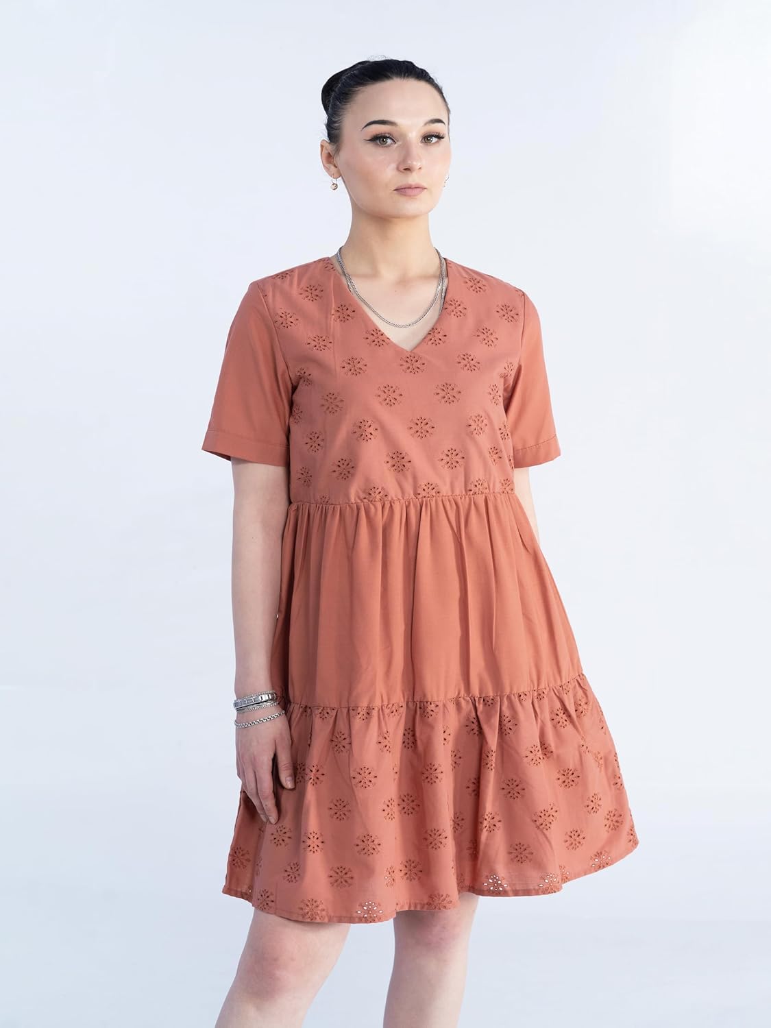 Women Summer Dress, Short Sleeve Eyelet V Neck Tunic Dress, Lightweight Casual Beach Sundress