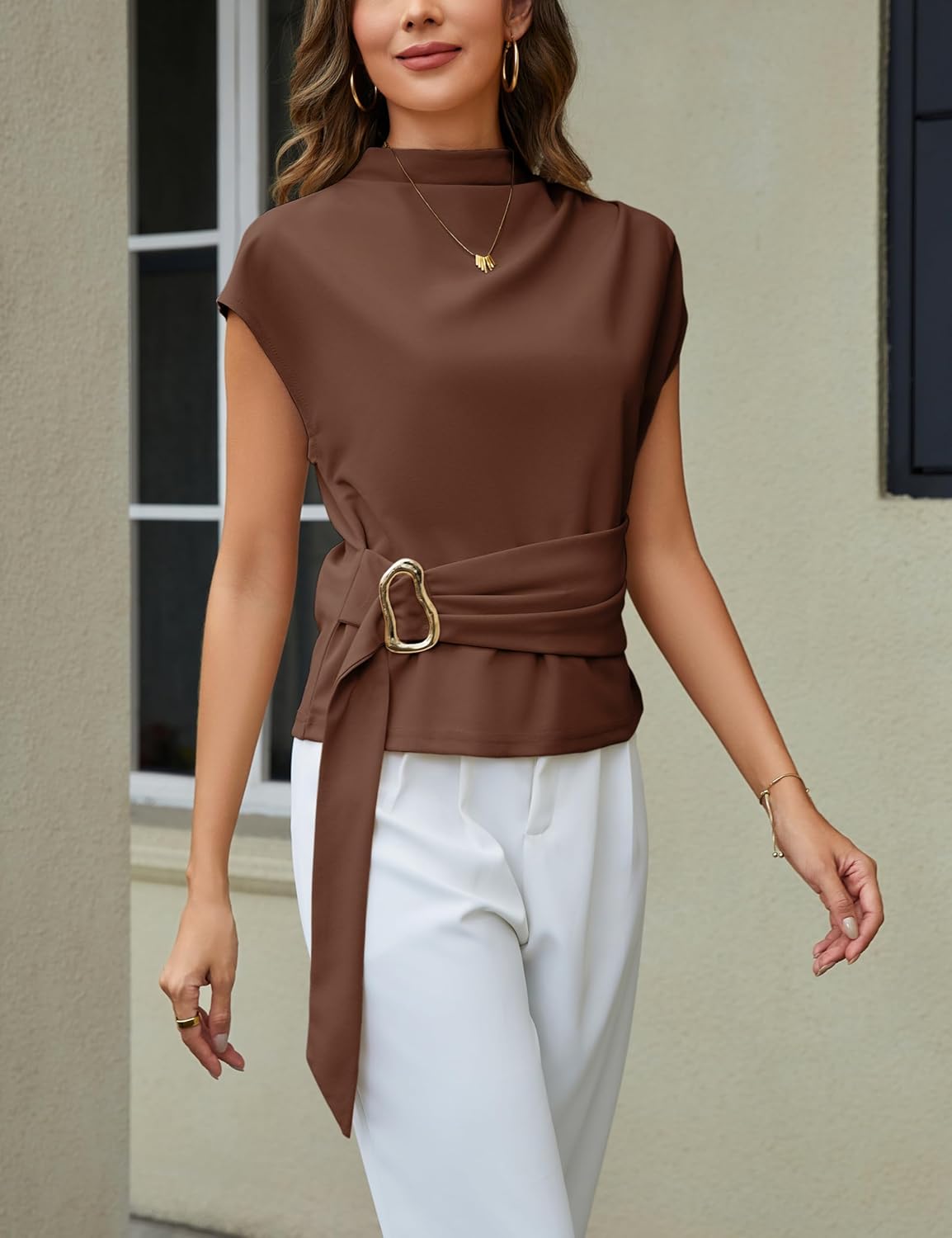 Yeokou Women Buckle Tie Top Stand Collar Belted Short Sleeve Elegant Summer Casual Blouse
