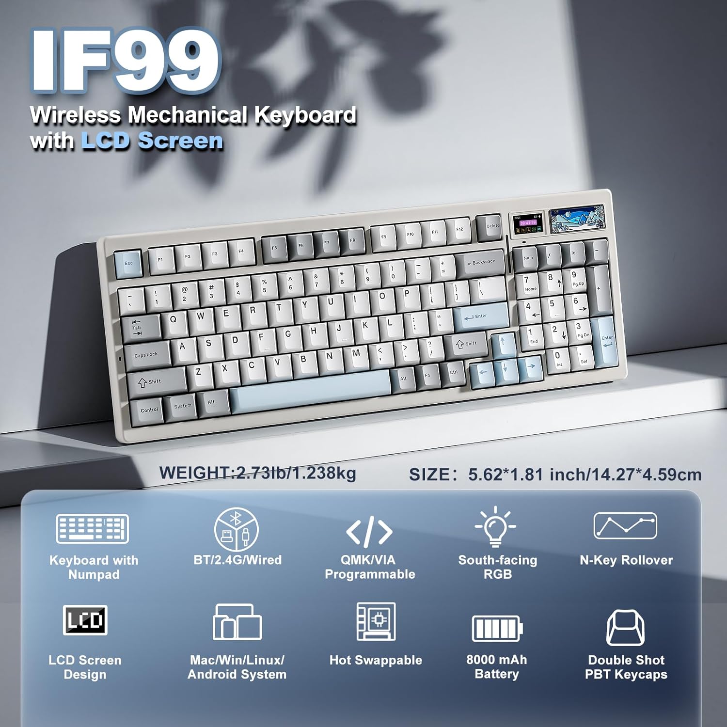 Custom LCD Keyboard for Personalized Display:YUNZII IF99 wireless mechanical keyboards features a customizable LCD screen that can display time, GIFs, photos, battery status, connection mode, and more. Personalize it with your favorite images, like pets or loved ones, to keep you motivated during work or gaming. Enjoy an added touch of personalization that sets your computer keyboard with screen apart